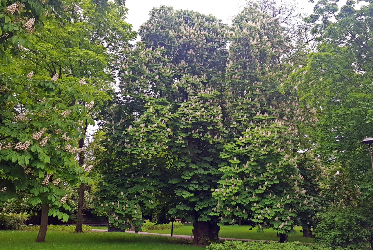 kasztanowiec zwyczajny (Aesculus hippocastanum L.), wiek ponad 200 lat, wys. ok. 20 m, obwód 540 cm, pomnik przyrody