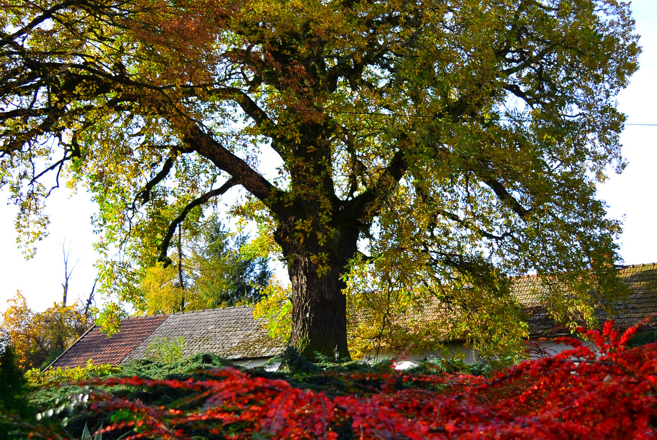 dąb szypułkowy (Quercus robur L), wiek 100 lat, wys. 15 m, obwód 285 cm, pomnik przyrody