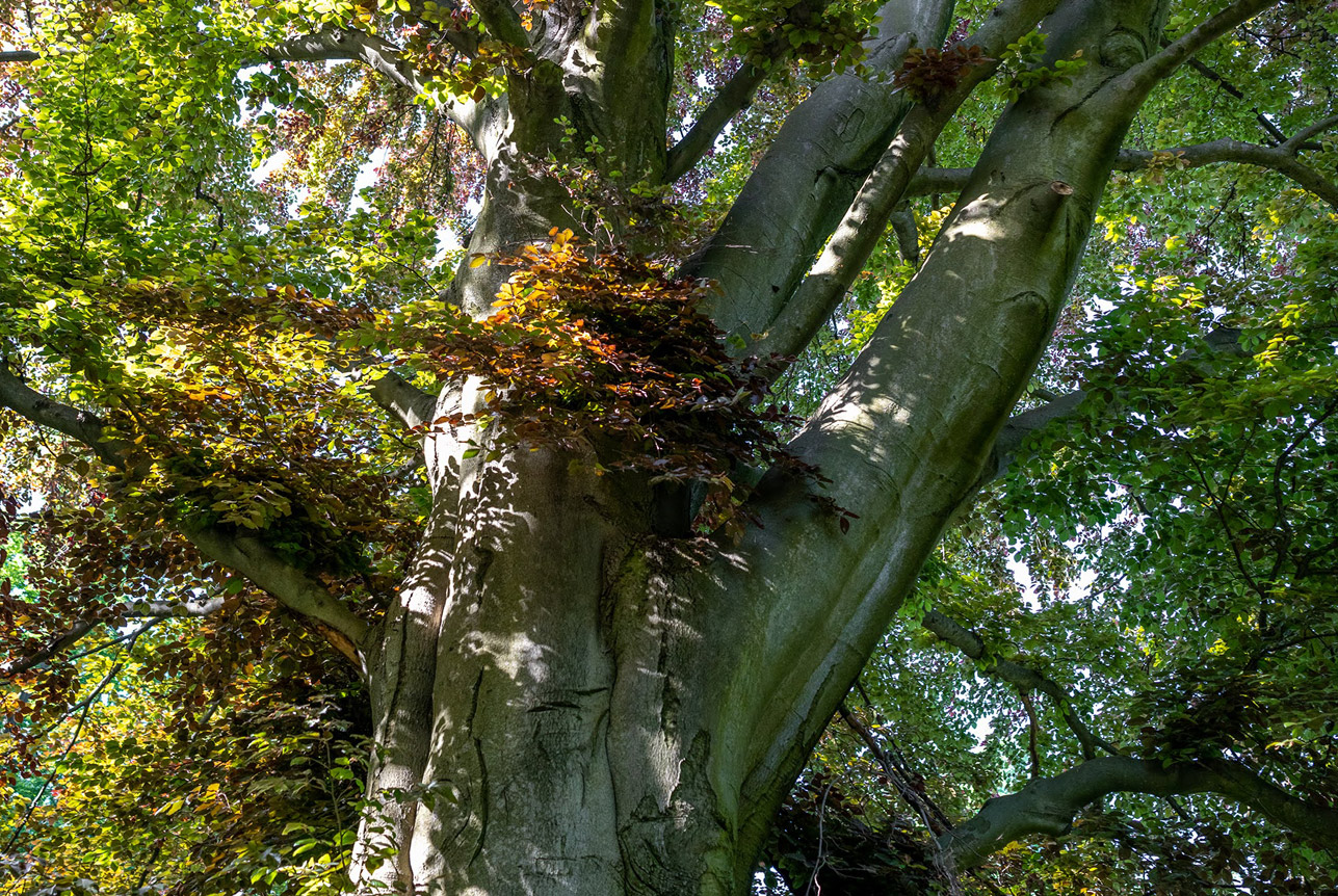 buk pospolity odm. purpurowa (Fagus sylvatica „Atropunicea”), wiek ok. 300 lat, wys. ok. 30 m, obwód 450 cm, pomnik przyrody