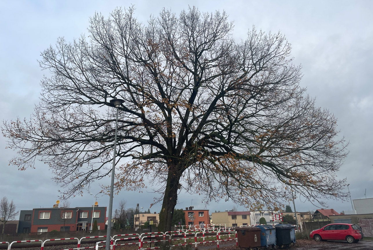 dąb szypułkowy (Quercus robur L), wiek ok. 110 lat, wys. 25 m, obwód 410 cm, pomnik przyrody