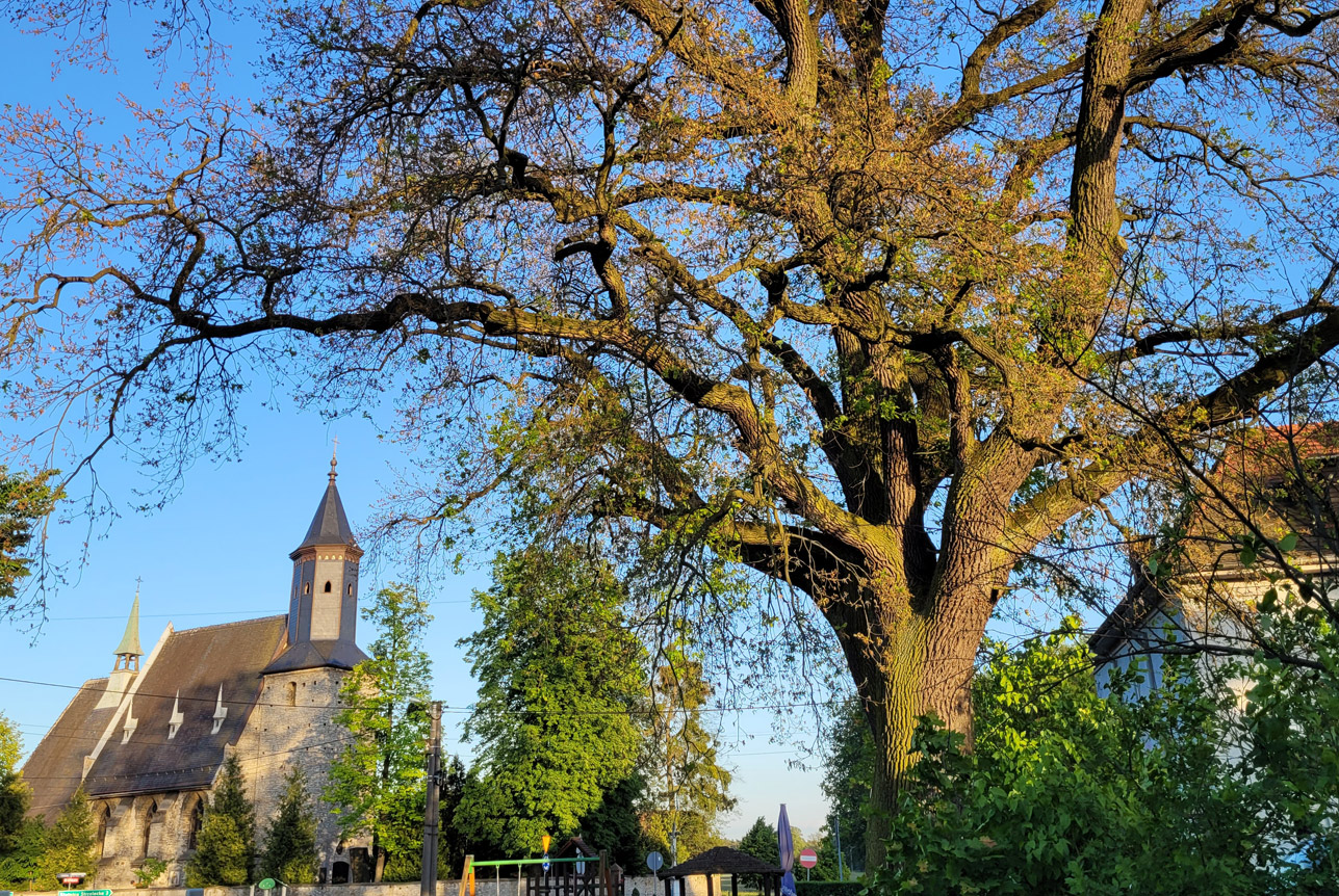 dąb szypułkowy (Quercus robur L), wiek 100 lat, wys. 15 m, obwód 285 cm, pomnik przyrody