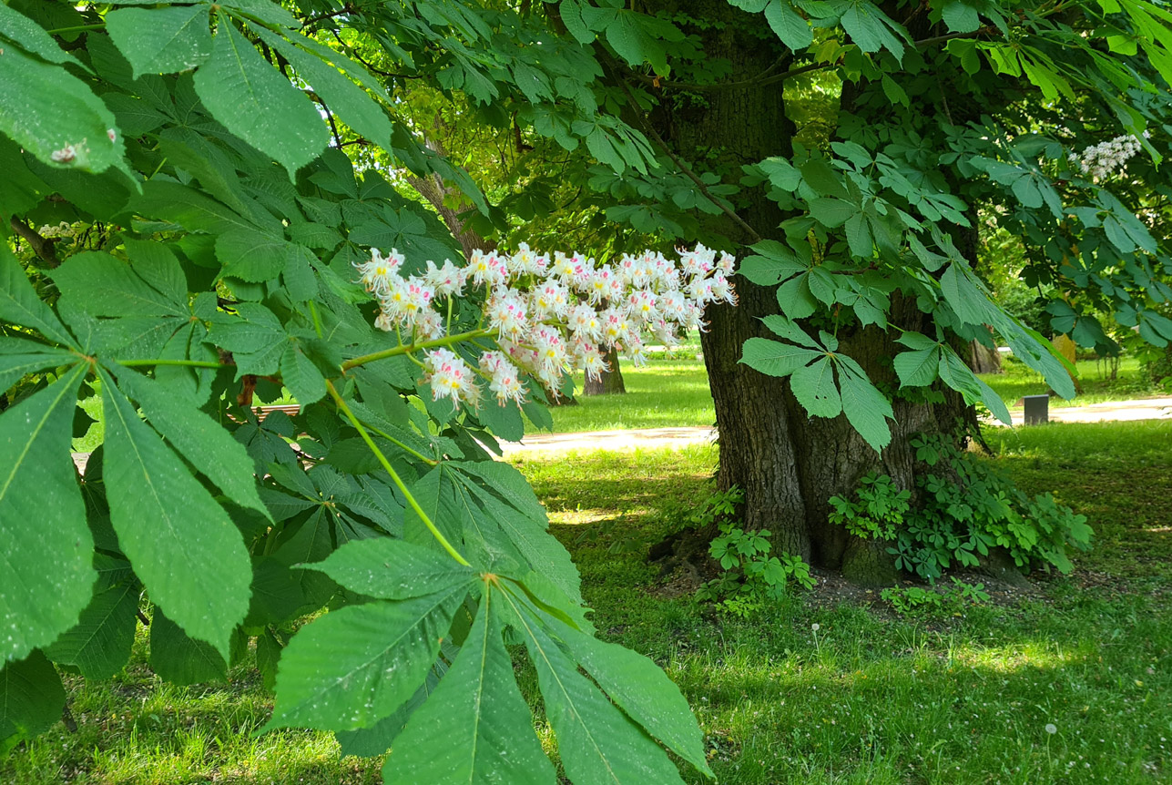 kasztanowiec zwyczajny (Aesculus hippocastanum L.), wiek ponad 200 lat, wys. ok. 20 m, obwód 540 cm, pomnik przyrody