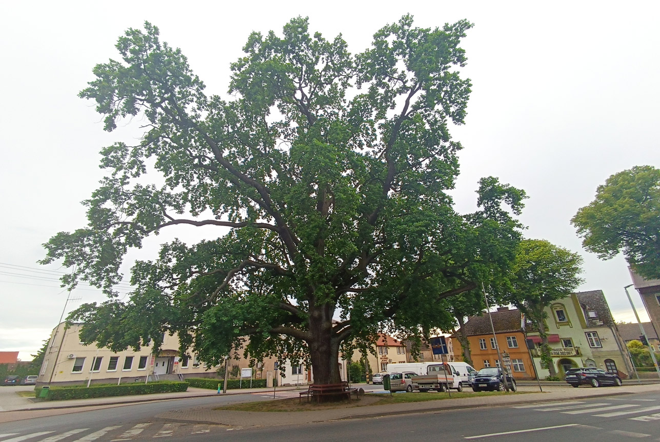 dąb szypułkowy (Quercus robur L), wiek 100 lat, wys. 19 m, obwód 310 m, pomnik przyrody